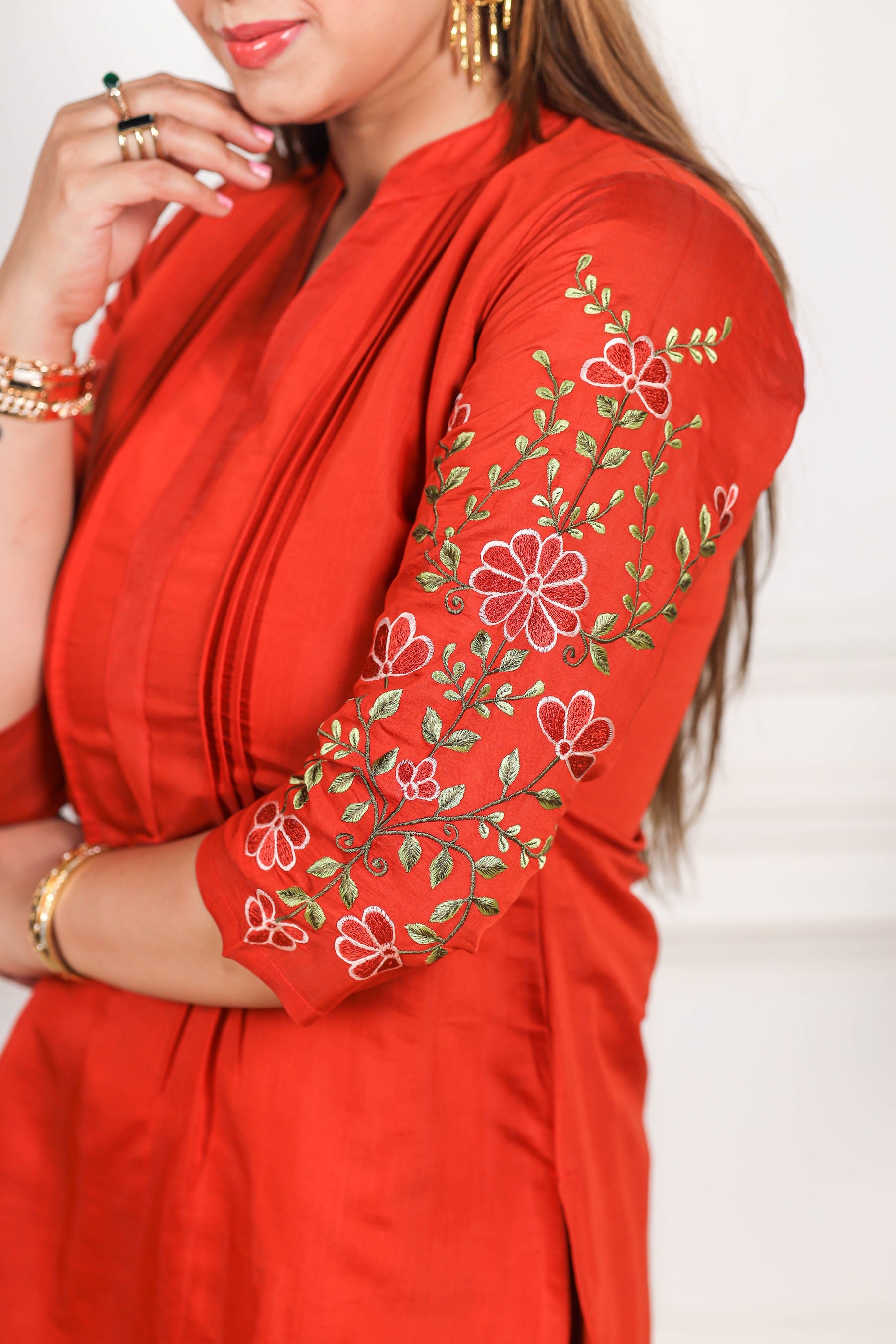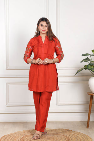 Embroidered Viscose mul chanderi Rust orange co ord set